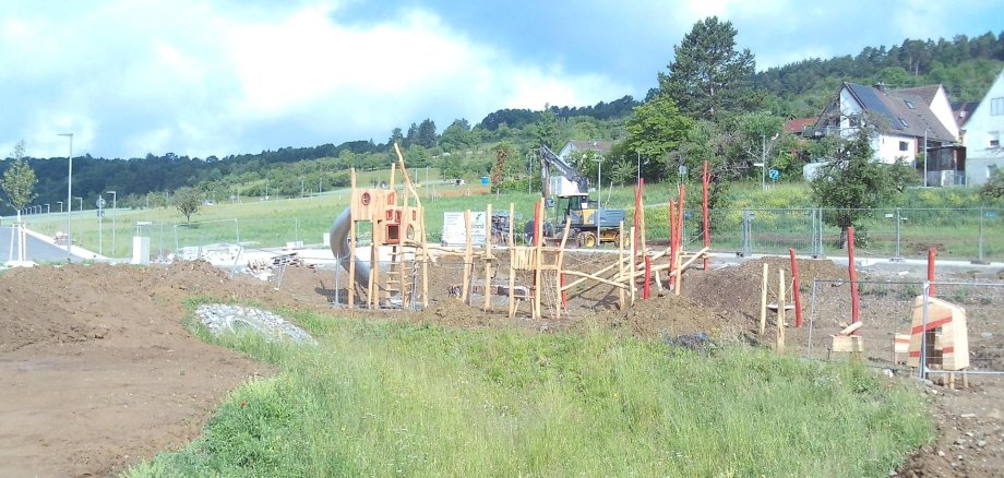 Der neue Naturspielpatz „Mittelfeld“ nimmt Formen an. Nach der Modellierung des Spielplatzgeländes wurden zwischenzeitlich die Spielgeräte und Kletteranlagen montiert. Der geplante Wasserlauf mit Handpumpe zum flachen Eulertgraben wird in den kommenden Wochen erstellt. Danach erfolgt die üppige Bepflanzung mit Bäumen, Sträuchern und Rasenflächen. Zum Gehweg an der Hauptstraße hin ist an der Böschung dichter Bewuchs vorgesehen, der eine Zaunanlage entbehrlich machen soll, um den natürlichen Charakter dieser Spielplatzanlage am Ortseingang zu unterstreichen.