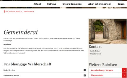 Hier findet man aktuelle Ausschreibungen und Vergabeverfahren, Informationen zum Bürgermeister, den Mitarbeitern in der Gemeindeverwaltung, dem Gemeinderat, dem Bürgerservice und Formularen, öffentliche Bekanntmachungen und Informationen zum Ortsrecht wie Satzungen und Verordnungen.